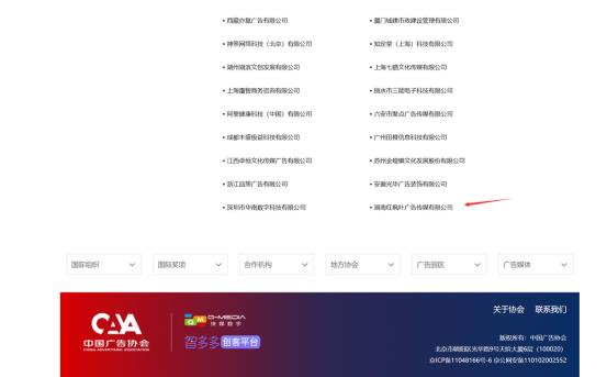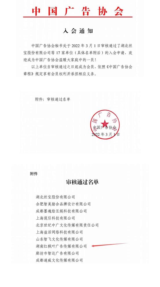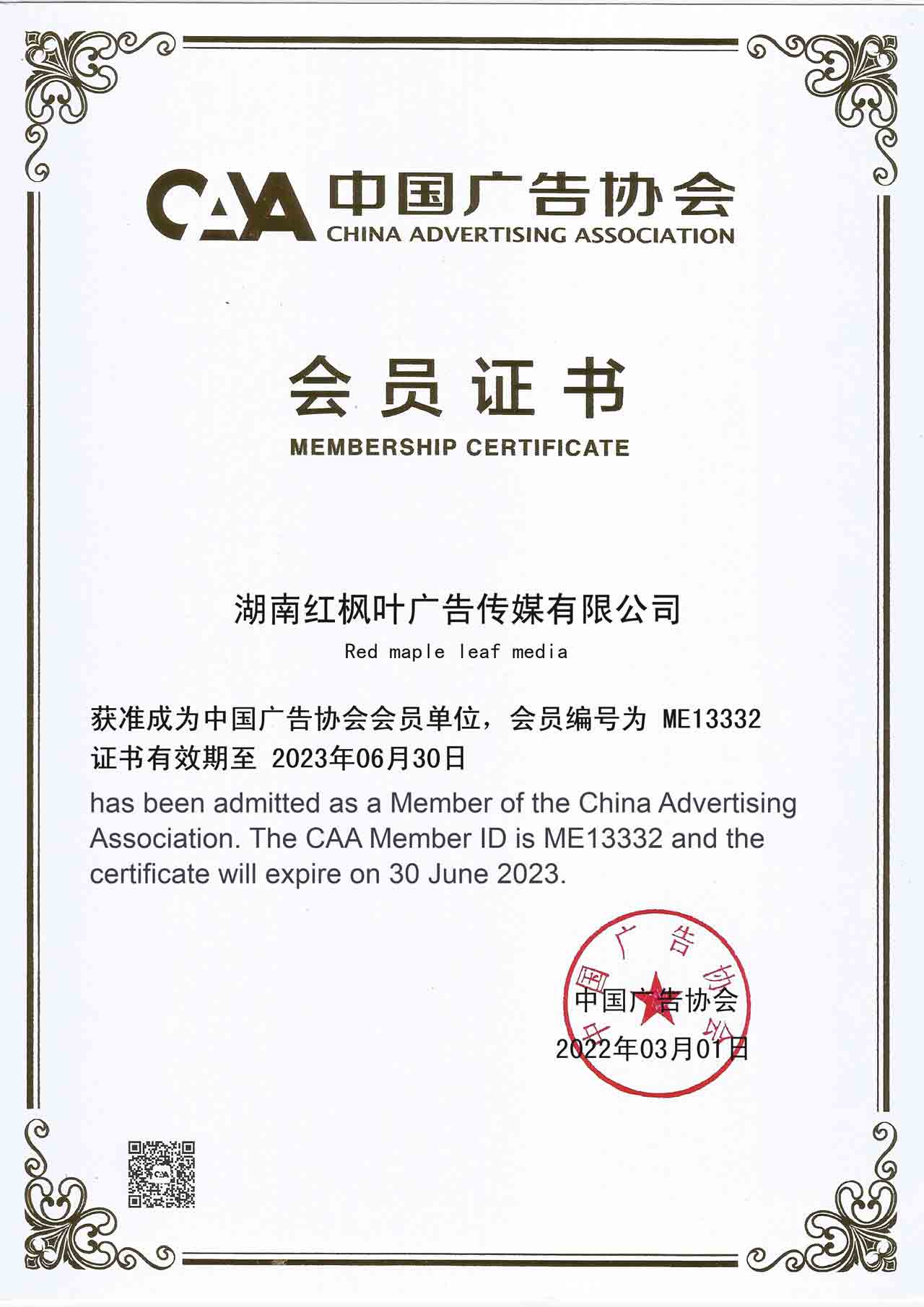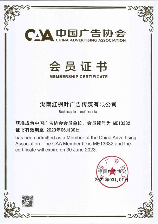 3月1日,經中國廣告協會審核,國家高新技術企業湖南紅楓葉廣告傳媒有限公司正式通過中國廣告協會資質認證,并獲得《中國廣告協會會員證書》,及中國廣告協會官方網站,會員單位名錄的收錄。